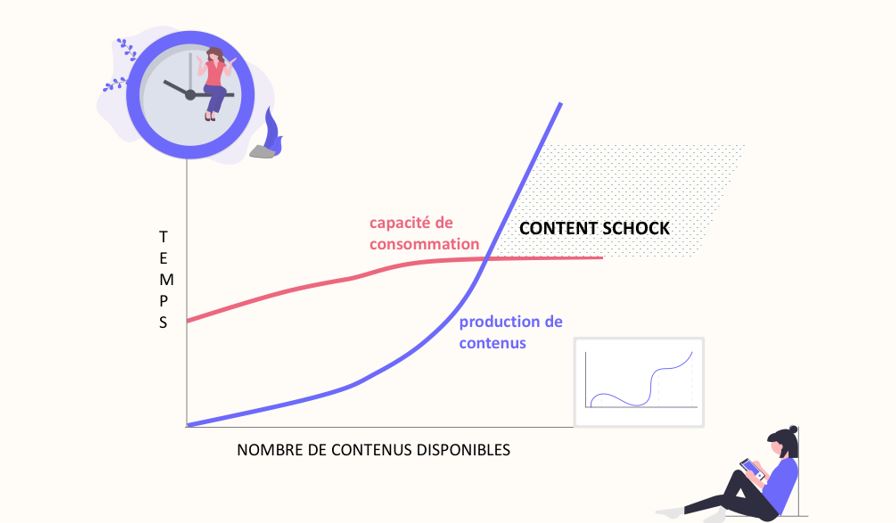 En effet, comme nous l’avions déjà vu dans le troisième article de la série à travers le concept de content shock de Mark Schaefer, la production de contenus disponibles sur Internet augmenterait beaucoup plus vite que le temps et l’attention disponibles des individus à qui sont destinés les contenus (voir le schéma ci-dessous).