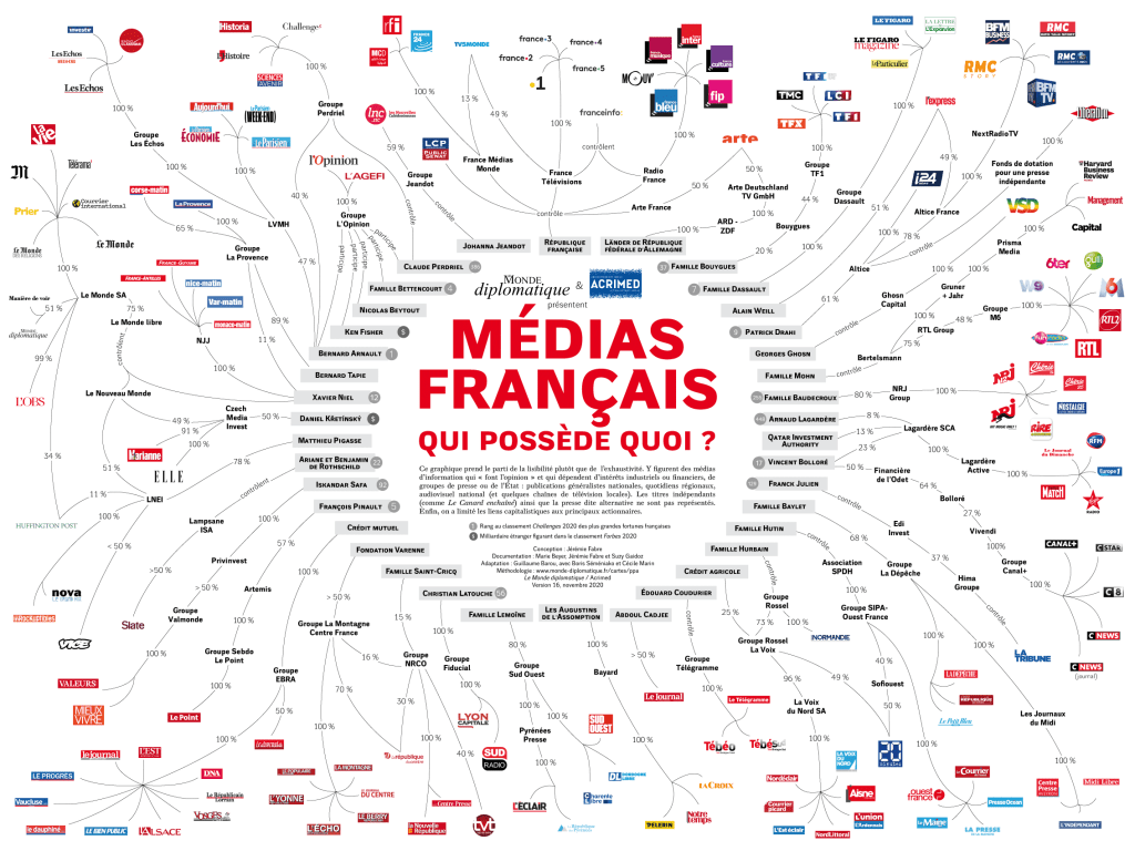 Pour un panorama exhaustif rendant compte de la concentration de l’industrie médiatique, Le Monde Diplomatique en collaboration avec Acrimed ont réalisé une infographie qu’ils prennent le soin de mettre à jour au rythme des rachats intempestifs :